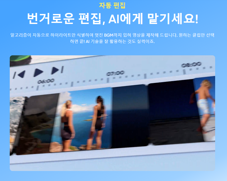 시간이 항상 부족한 현대인들에게 AI편집은 큰 선물이죠. 인스타그램이나 페이스북에 올릴 작은 동영상은 충분히 맡겨도 됩니다. 배경음, 비트, 영상편집 다 알아서 다 해주니까 너무 좋죠.