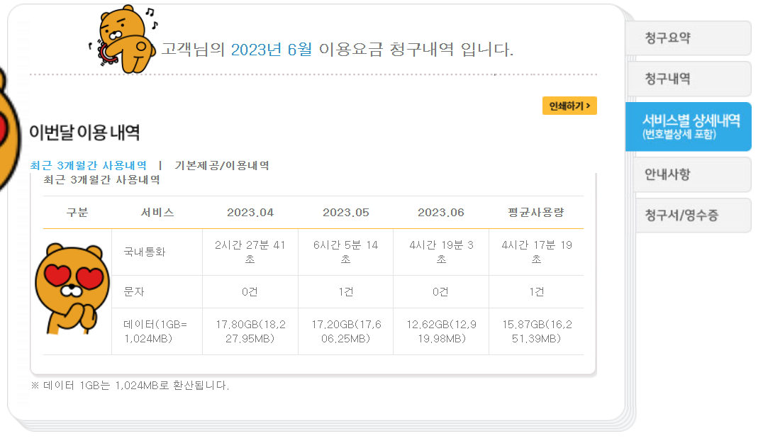 보시는 바와 같이 4월에는 17.8GB 5월에는 17.2GB 6월에는 12.62GB를 사용했습니다. 평균적으로 15GB이상 사용하는데 어떤 달은 30GB 가까이 쓴 적도 있습니다. 매월 11550원의 요금제로 무한정 데이터/음성통화는 그 가치가 굉장히 높다고 생각합니다.