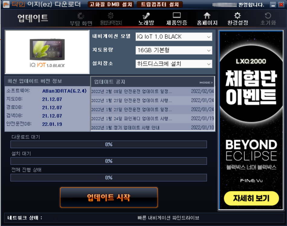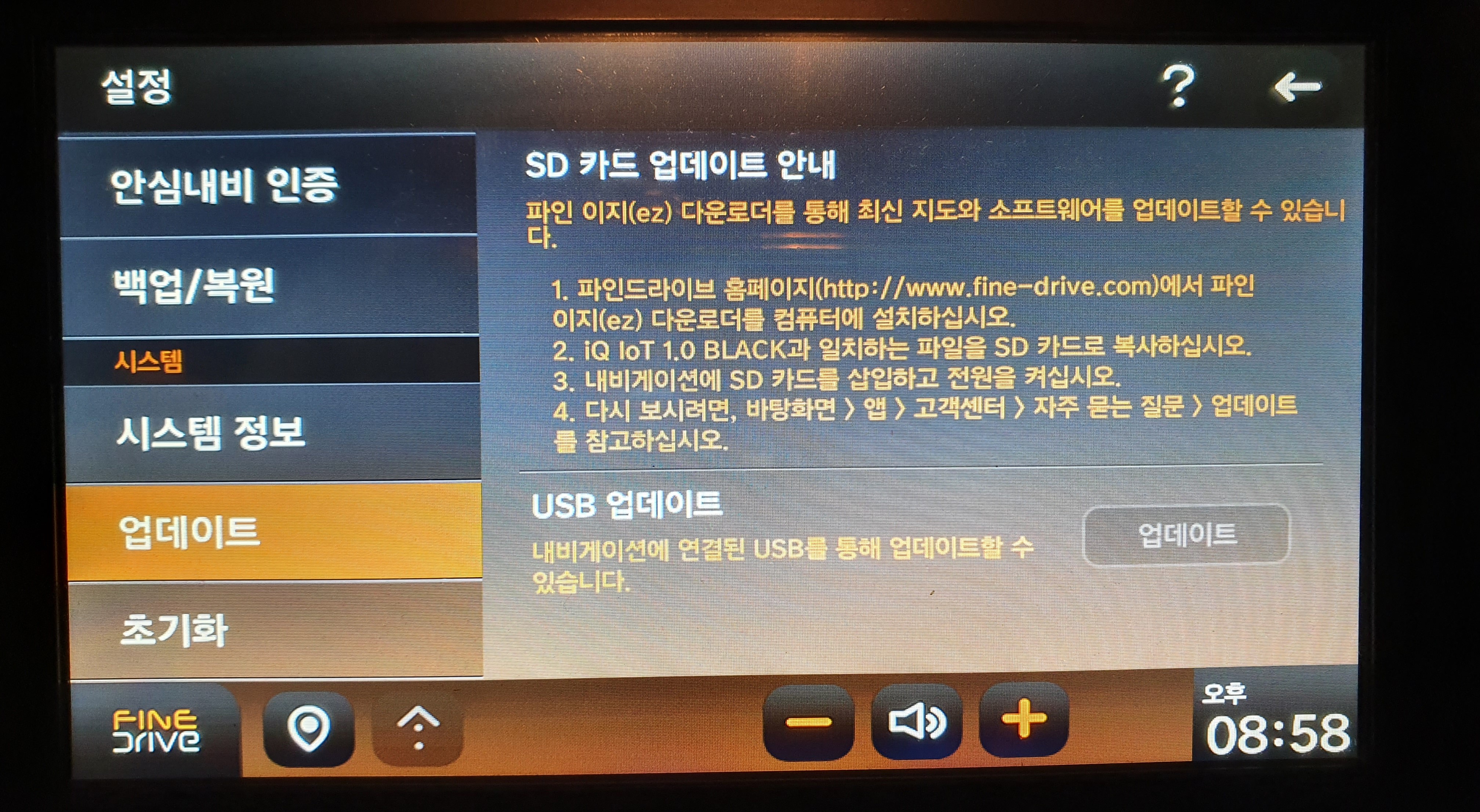 파인드라이브 SD카드를 컴퓨터나 노트북에 꽂아서 설치장소를 SD카드로 설정하고 업데이트 시작을 누르면 됩니다.