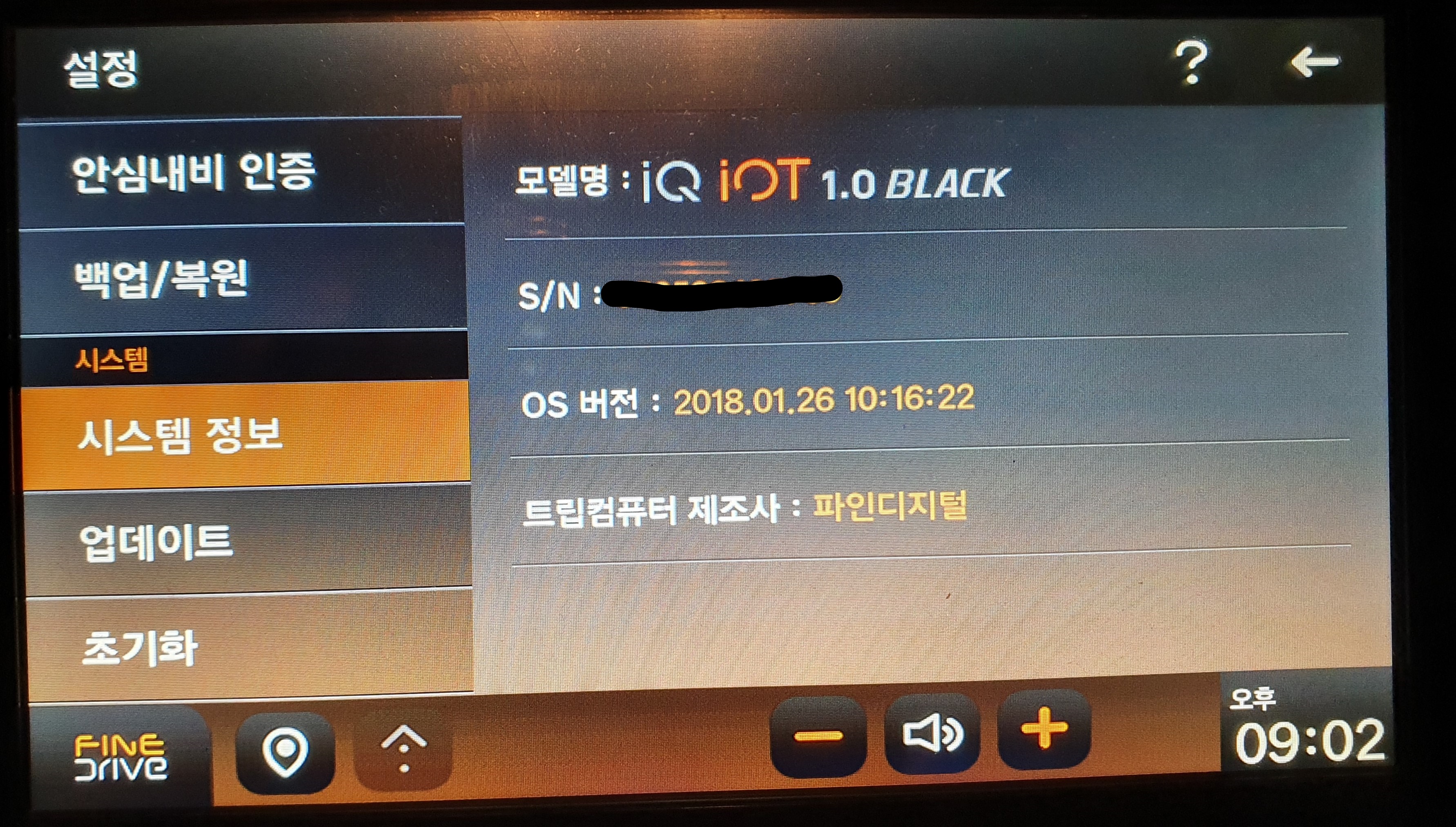 제 차량의 내비는 파인드라이브 내장형 모델인 IQ iOT 1.0 Black입니다.