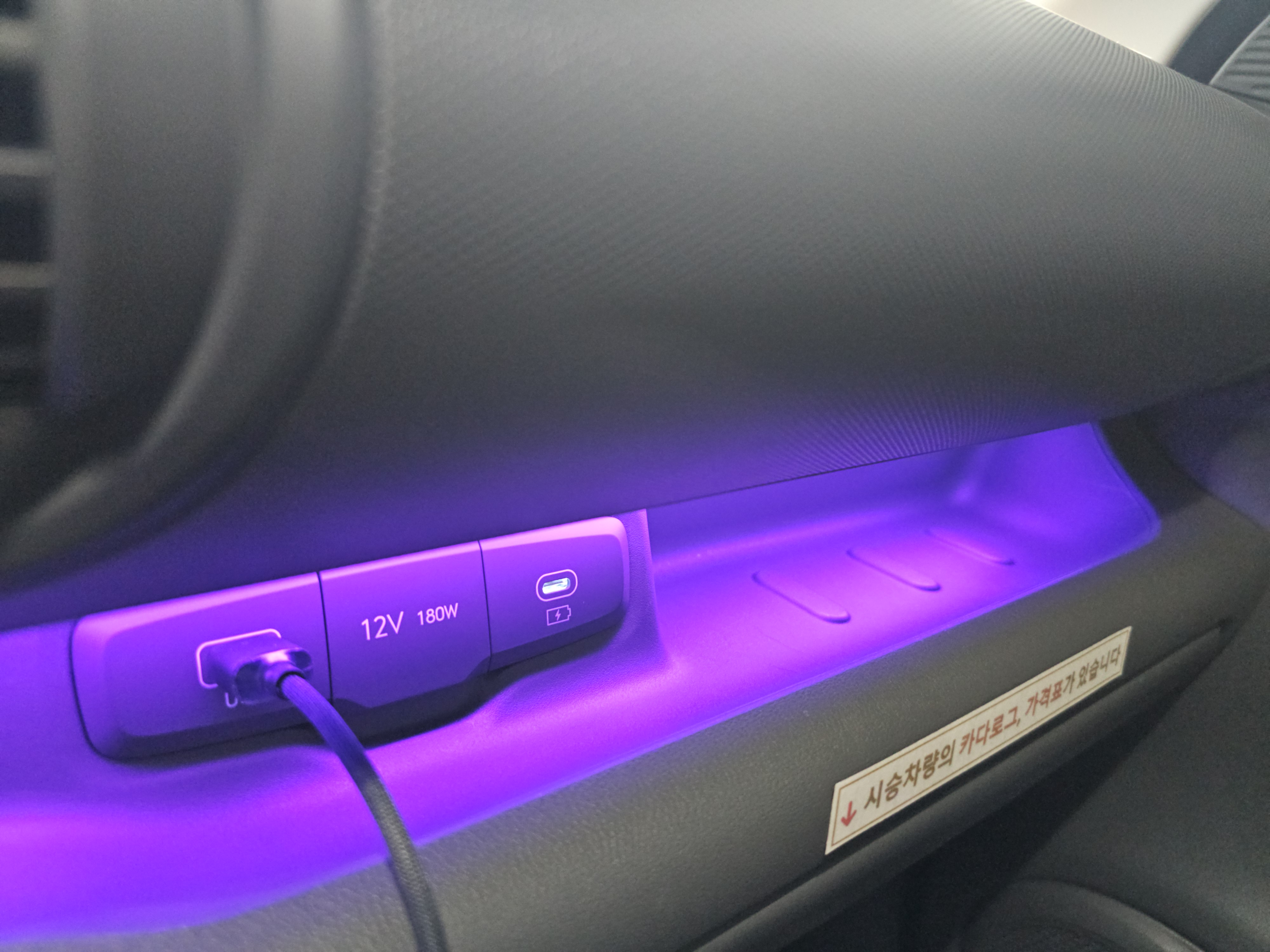 캐스퍼 EV의 또 다른 매력은 V2L 기능입니다. V2L은 'Vehicle to Load'의 약자로, 차량 내에서 외부 전자기기를 충전하거나 전원을 공급할 수 있는 기능입니다. 실내에 설치된 V2L 단자는 가정용 전원이 필요한 기기들(예: 노트북, 소형 가전기기 등)을 사용할 수 있습니다. 이 기능은 캠핑이나 장거리 여행 시 매우 유용하며, 일상에서도 편리하게 활용할 수 있어 현대적이고 실용적인 전기차 생활을 지원합니다.